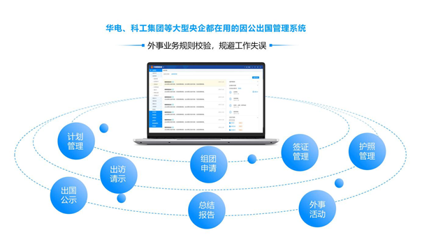 外事管理系统(因公出国小管家)是一套针对企事业单位员工因公出国和外宾来华访问的全过程管理系统。系统具有计划按批次追踪功能,可对计划变更进行合规性判断,可对同一计划中数量极多的文件进行闭环管理,极大减轻计划跟踪,计划合规性判断与计划文件校对工作量。使用系统可提升外事业务审核工作效率,出国申请办理平均时间由两个月缩短到7个工作日;可减少工作失误率,系统内置外事引擎做合规性检查,误审次数降低到千分之一;可优化员工办理出国业务体验感,提升企业形象。