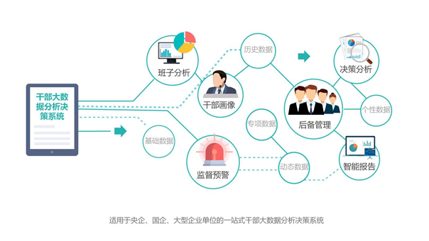 干部大数据分析决策系统是一款基于大数据思维的干部管理产品,该产品可从多个维度展现单位领导班子现状,实现干部队伍结构、党风廉政、后备培养、绩效考评、经营业绩、民主生活会、谈心谈话等关键数据的线性分析和走势预测,辅助领导优化班子结构配置;通过对领导干部成长路径、工作分工、个人诉求、日常实绩、现实表现、思想动态、生活轨迹等数据动态分析,实现干部精准画像,并建立实时“预警灯”,进行实时预警提醒。系统还能自动生成考核、调整、年终总结等多类报告,实现全方位、立体化的数据分析。采用该产品可大大减轻干部管理的工作量,为选人用人、干部监督、梯队建设、班子评优等工作提供针对性的对策和建议,辅助领导分析决策。