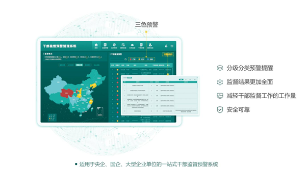 干部监督预警系统是一款基于大数据思维的干部管理产品。该产品能够灵活配置领导干部的监督事项与预警规则,快速构建干部监督评价模型,帮助政企单位进行干部选任、干部履职、日常工作、干部要事、舆情等业务的工作监督,发现问题事项后可以根据严重程度进行“红黄蓝”三色预警提醒,通过颜色来识别干部“健康度”。该产品将海量干部监督数据进行整合分析,大大减轻人工监督工作量大、查阅工作繁琐等痛点问题;前移干部监督关口,及时发现苗头性和倾向性的问题,辅助进行干部调整、班子建设等工作。