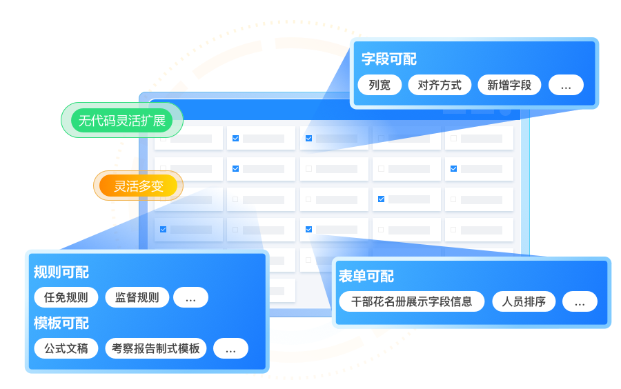 系统支持字段、表单、规则、模板的全面灵活配置,快速响应企业需求。