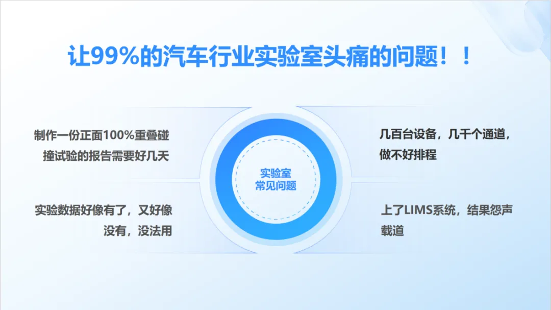 综合赛事华体会体育官方网站智慧实验室产品负责人王一吏在会上指出,当前车企实验室管理普遍面临四大挑战:一是实验报告编写效率低;二是设备综合利用率不清晰;三是实验数据结构化能力弱;四是传统LIMS应用更新能力不足。针对这些问题,综合赛事华体会体育官方网站提出了一系列创新解决方案,旨在帮助车企提升实验室管理效率,强化质量控制能力。