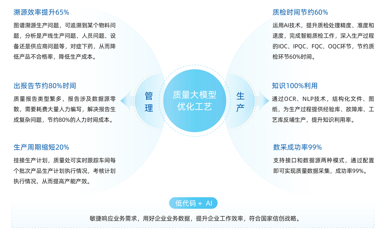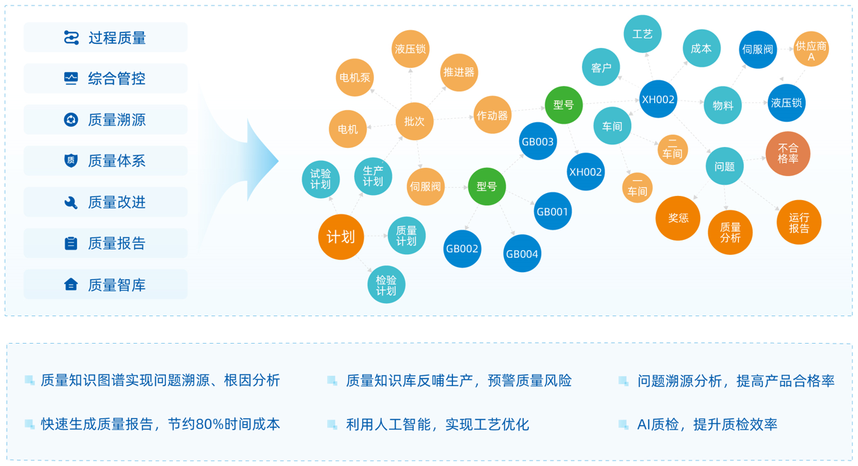 综合赛事华体会体育官方网站质量数据管理华体会体育官方网站引入“双五归零”质量管理方法,通过知识图谱、OCR、NLP等前沿技术,建立质量主数据的图数据链路,具备质量问题溯源、根因分析等能力,帮助企业高效完成生产、试验、检验各环节质量问题的高效管控,同时结合质量知识库,智能、快速生成质量相关报告,实现质量问题归零、优化工艺、降低成本的目的。