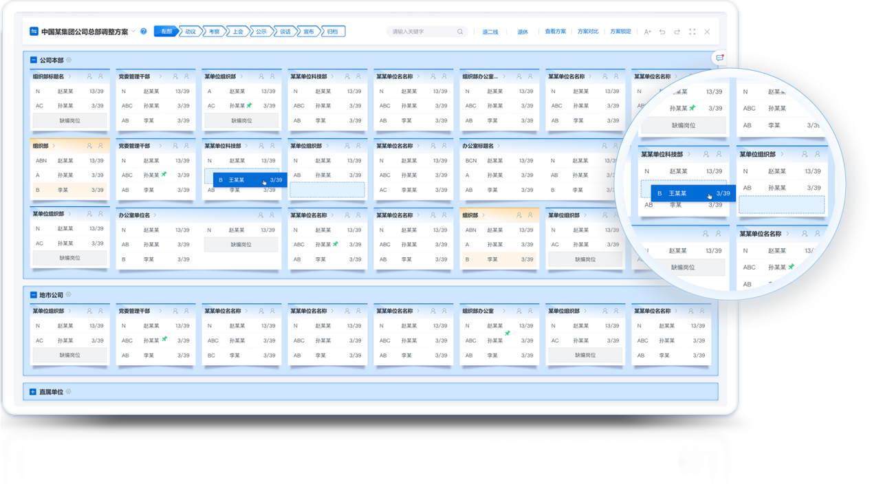 将班子和干部信息直观展现在PAD上,通过简单的“拖拽”实现干部岗位的调整,调整过程中可查看干部详细信息,进行多人比对,同时,基于内置的干部任免规则自动进行合规判断,降低用人风险。