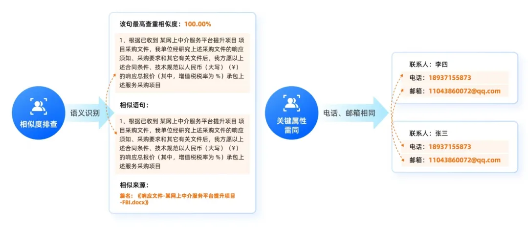 利用自然语言处理(NLP)技术,通过文本分析实现深度语义比对查重,能够高效比对投标文件的关键核心数据,迅速识别雷同信息及相似语句,并提供精准的相似度比例。