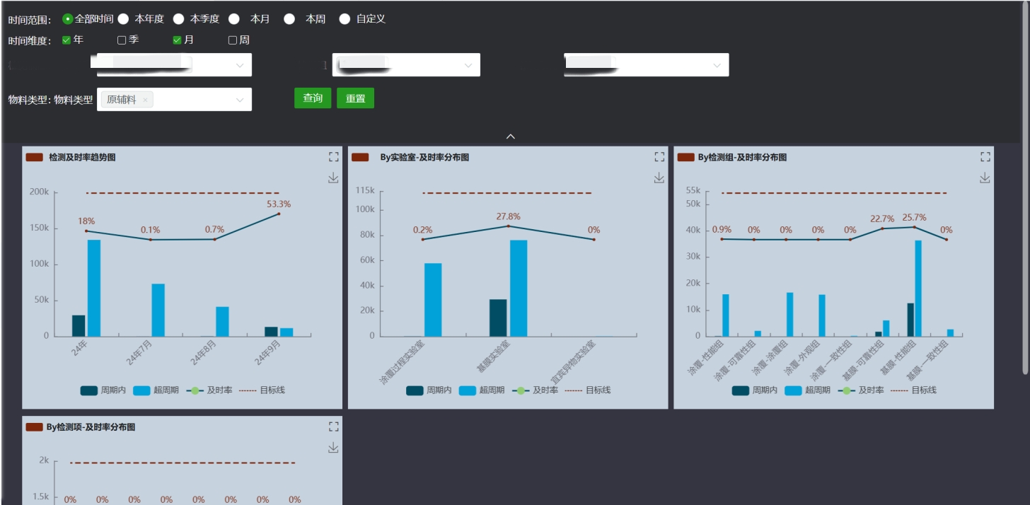 为确保产品质量,中材锂膜建立了从生产到成品的全流程检测体系:不仅要在生产完成后检测成品质量,还要在生产过程中实时监测各项指标。而检测的及时性是保证结果准确的前提。从样品接收到所有检测项目完全提交,综合赛事华体会体育官方网站LIMS对实验室检测进行全流程管理,根据不同需求进行分类管理,实时追踪检测进度,并直观展示各基地的检测项目及时率数据,方便快速定位延误环节,对不及时的项目进行重点关注和把控。