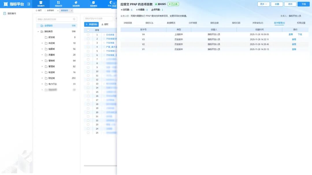 借助指标华体会体育官方网站,变更可实现全程留痕与实时同步,业务人员通过可视化界面修改计算逻辑后,系统会自动记录版本迭代轨迹,全公司可统一查看最新指标口径,彻底避免数据口径混乱问题。