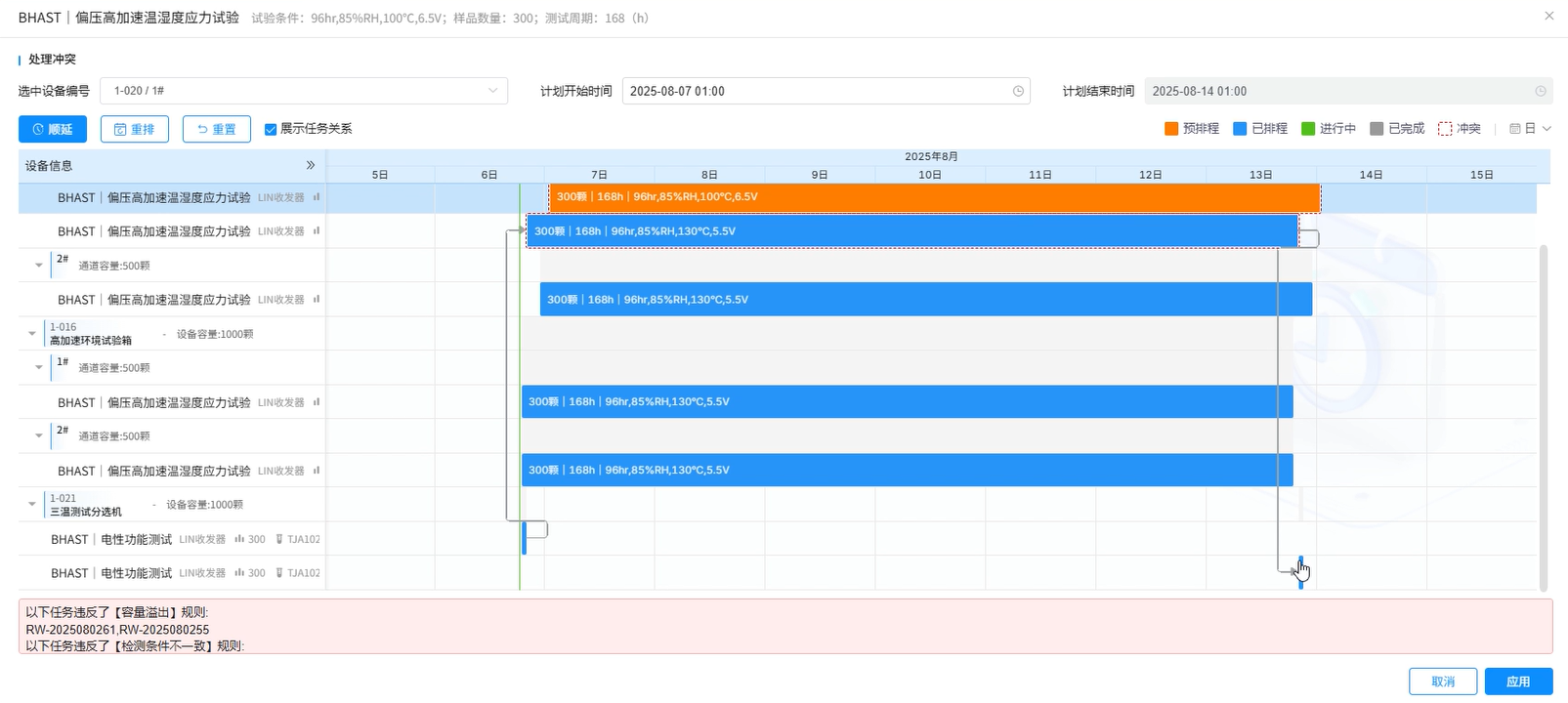 需求方,业务扩张与研发提速让测试样品呈现“小批量、多品类”爆发的态势,对于三方实验室,客户交付周期持续压缩,临时加急(生产停线、客户上市、领导特批)成为常态,彻底挤压排程缓冲空间。实验室,设备看似数量充足,实则细分专用、难以通用,长周期、连续性测试不能中断,再加上校准、维护、检定等占用时间,有效利用率也就70%-80%;同时检测员需持证上岗,专人专机绑定,进一步限制了排程灵活性。工具层面,很多实验室还在用 Excel 排程,看不到设备实时状态(比如是否在运行、剩余测试时间),也没法快速计算调整排程后的影响(比如插一个急单,会导致多少已排期任务延迟)。排程表不透明,业务部、生产部、销售部看不到进度,频繁追问,进一步增加工作负担。「那我们就要想办法去解决这种困境,最简单的思路是,人做不了的,让机器做。先解决排程透明化,再解决自动排程,最后再解决智能排程。」对于设备数量有限、任务相对简单的实验室,瓶颈设备可能就那么几台,这时候,最直接的痛点其实是“别撞车”。就像预约会议室一样,能让大家清楚地看到谁在什么时候用了什么设备,冲突就少了一大半。这个阶段,一套清晰的设备预约系统,往往就能让整个实验室的运转清爽起来。在有些电子或锂电企业,环境箱就有数百甚至上千台。只是排程透明已经不行了,还要解决如何高效排程,并且能处理临时、加急、插队等情况。这时,系统如果能“聪明一点”,会带来完全不同的体验。它可以根据预设的规则,自动推荐出一个合理的排程草案:哪些任务可以合并进行,哪些设备可以错峰使用,哪些加急订单可以巧妙插入而不影响整体进度……实验人员拿到这个草案后,不再需要从零开始,只需做些微调,一个可行的计划就诞生了。这种“系统推荐 + 人工微调”的模式,在不少实验室里,正悄悄把排程时间从几个小时缩短到十几分钟。
